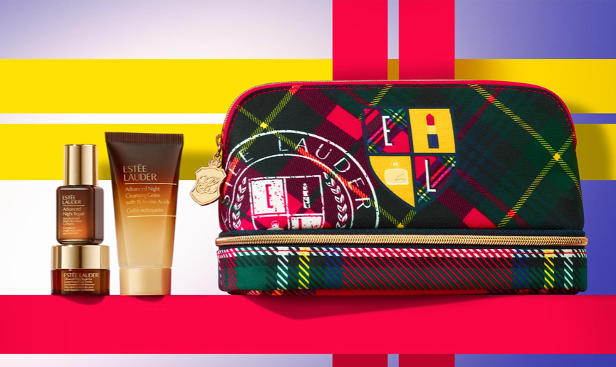 ESTEE LAUDER FALL 2023 GWP: BADGES. PULL AND TARTAN PATTERN MIXING